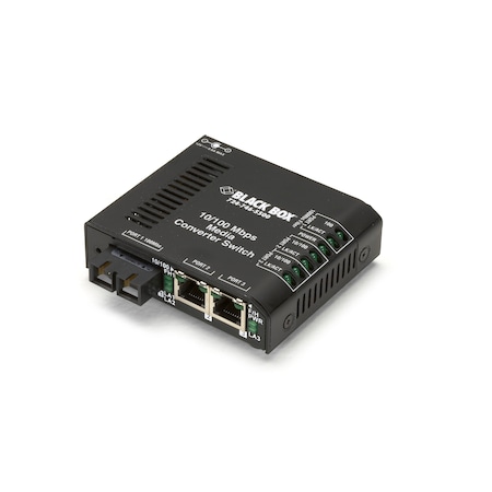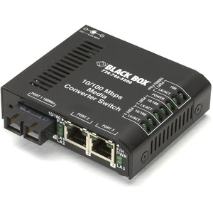 BlackBox, LBH100AE-SC, 10-/100 Copper to 100 Fiber Media Converter Switch w/ IEC & SC Switch and convert 10-/100-Mbps copper to 100-Mbps fiber in office areas. Features: Function as both a media converter and a switch. Suitable for office environments. Support VLAN tagging and spanning tree passthrough. Provide one 100-Mbps fiber port and two 10-/100-Mbps UTP switch ports. RJ-45 ports support autonegotiation, so you can easily attach any 10- or 100-Mbps device. SC fiber port type. Support both half- and full-duplex operation. Two sets of LEDs enable you to see status information from the front, top, or side. Rackmount up to 16 units in the optional Rackmount Tray or Powered Rackmount Tray (available separately). BLACK BOX Standard Media Converter Switches do more than just adapt from one cable type to another. They're true Ethernet switches and behave like switches within your Ethernet network. This means you can connect them together indefinitely without worrying about interrepeater links. Each Media Converter Switch features non-blocking switching architecture with a 2K MAC address table. The 128K buffer memory makes it easy to interconnect 10- and 100-Mbps devices. Use them in your office. Standard Media Converter Switches are for use in clean, temperature-controlled environments such as offices and wiring closets. Media Converter Switches are also available in Hardened versions for industrial environments and Extreme versions for outdoor environments. Because all three types work together seamlessly, you can use inexpensive Standard Media Converter Switches in the protection of the wiring closet and choose the more robust Hardened or Extreme Media Converter Switches for harsh locations at your network's edge. (We also offer Media Converter Switches in 10-Mbps fiber versions for use with older fiber infrastructures.) Distance isn't a problem. Because they're switches as well as media converters,