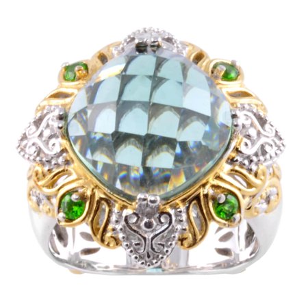 <ul> <li>Gemstone colors: Green</li> <li>Gemstone shapes: Cushion, round</li> <li>One prong-set cushion-cut green quartz measures 12 mm wide x 12 mm long</li> </ul>