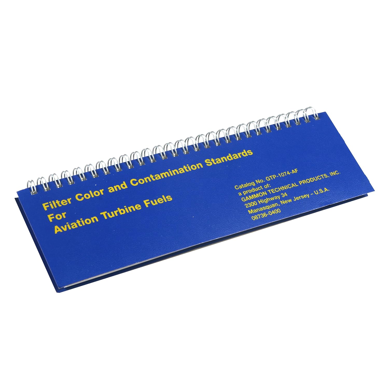 "Gammon ASTM Color Rating Booklet for rating Aviation Turbine Fuels GTP-1074-AF. For use in color rating filter membranes for aviation turbine fuels in accordance with Appendix X1 of ASTM Test Method D2276/IP216. GTP-1074-AF This booklet contains the same color rating pages as the standard booklet, with the addition of a particle assessment rating guide at the back of the book. ▪ Each color standard panel has been certified in accordance with the Munsell Color rating system to Triple A standards for chroma, value, and hue. ▪ Every color page is wire bound. ▪ Each color standard has a 1 inch (25mm) window so that the membrane can be viewed for better accuracy in color rating. ▪ Every color page has an index tab to speed up finding the right page. ▪ Margins are provided at the ends of color pages to avoid fingerprints on color panels. ▪ Fuel resistant lamination is provided on the back on each color page and on an interleaf between each color page. This prevents a wet membrane from soaking the page and possibly altering the color