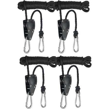 * Specification: pair of 1/4inch heavy duty rope hangers, 8-feet long, 4 easy-to-use Carabiner clips. Up to 150-pound load capacity per ratchet, 300-pounds per pair * Rope material: braided polypropylene. Hook material - zinc plated steel / metal internal gears * Loose-proof design: the rope automatically locks into the place you pulled and will stays locked until you release it by pushing the thumb release lever. Do not need to worry about stretching, snapping back or loosening * Multiple application: can be used as a grow light hanger, tie down rope, rope hook. Can work as an adjustable rope hanger, or a locking pulley. Help to take the hard work you need to do * Package includes: 2-Pair 1/4 inch ratchet tie down, comes with 8 feet tear resistant high tenacity solid braided polypropylene rope