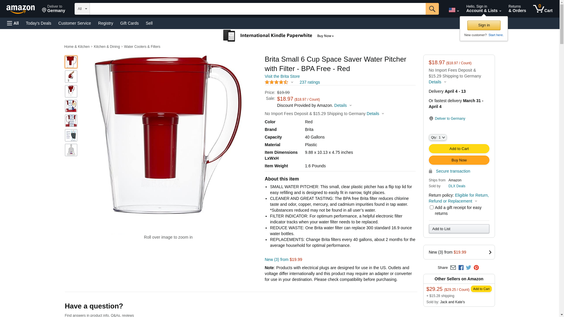 Important Made in USA Origin Disclaimer: For certain items sold by on the displayed country of origin information may not be accurate or consistent with manufacturer information. For updated, accurate country of origin data, it is recommended that you rely on product packaging or manufacturer information. Brita makes it easy to drink healthier, great tasting water for pennies per gallon. Brita Space Saver Water Filter Pitcher is BPA free, and reduces zinc, chlorine taste and odor, copper, mercury and cadmium. For optimal performance, use the filter indicator to track when to replace the advanced filter. Its space saving size makes it perfect for smaller refrigerators, dorm rooms and offices. Plus one water filter can replace up to 300 standard 16.9 ounce plastic water bottles. Get great taste, less waste and more savings from Brita. Your water filter pitcher can be ready to use in a few steps. Wash your hands before touching the filter, then flush it with cold water for 15 seconds. Insert the filter into the reservoir. Add cold tap water. The first three pitchers of filtered water may contain carbon dust. Use on plants or discard. Replace the water filter every 40 gallons or two months.