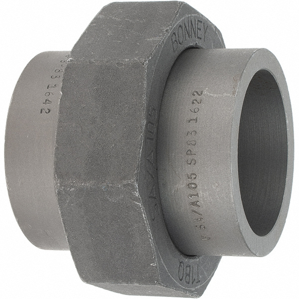 | Feature | <b>Price For:</b> Each <b>Number of Holes</b>: 2 <b>Pipe Fitting Material</b>: Black Forged Steel <b>Basic Fitting Material</b>: Metal <b>Saturated Steam Pressure</b>: 300 psi @ 550 Degrees F <b>Temp. Range</b>: -20 Degrees to 550 Degrees F <b>Fitting Schedule/Class</b>: Class 3000 <b>Basic Fitting Shape</b>: Union <b>Specific Fitting Shape</b>: Union <b>Standards</b>: ASME B16.11, ASTM A106, MSS SP-83 <b>Outside Dia.</b>: 4-27/64" <b>Item</b>: Union |