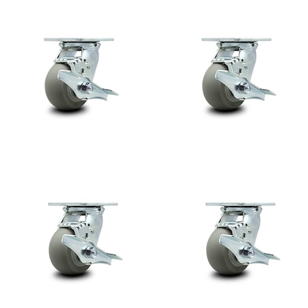 Thermoplastic Rubber Donut Tread Swivel Caster w/Main. Free Bearings Set of 4 w/4" x 2" Gray Wheels - Includes 4 Swivel w/Top Lock Brakes & Bolt on Swivel Locks-1200lbs Total Cpty-Service Caster Brand