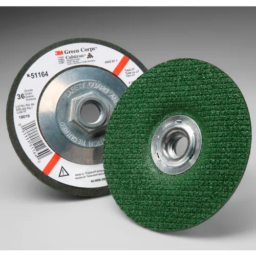 3M Green Corps Ceramic Surface Grinding Wheel - 36 Grit Very Coarse Grade - Threaded Arbor Attachment - 4 1/2 in Dia - Thickness 1/8 in - 13300 Max RPM (Set of 40/EA)