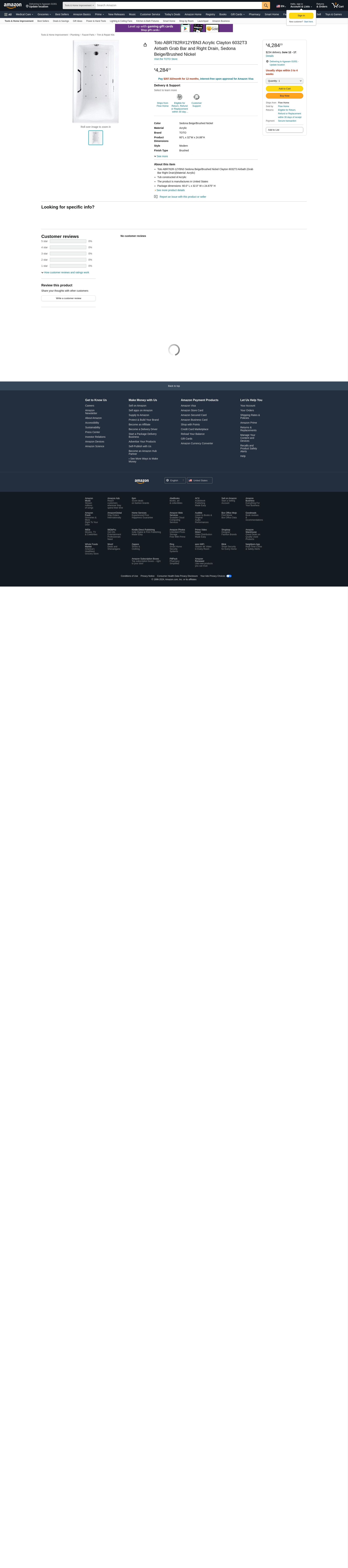 - Toto ABR782R-12YBN3 Sedona Beige/Brushed Nickel Clayton 6032T3 Airbath (Grab Bar Right Drain)(Material: Acrylic)