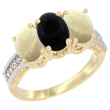 14K Yellow Gold Natural Black Onyx & Opal Sides Ring 3-Stone 7x5 mm Oval Diamond Accent, sizes 5 - 10
