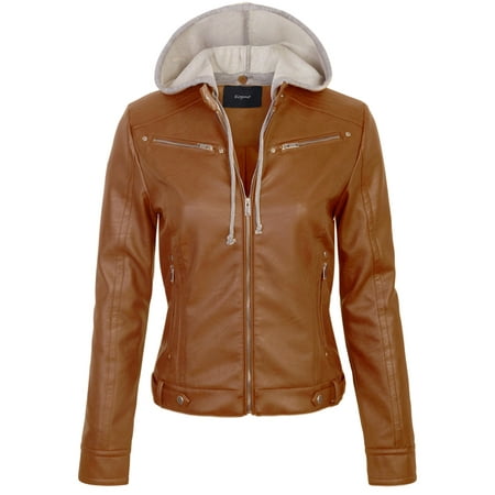KOGMO Womens Faux PU Leather Zip Up Casual MOTO Jacket with Hoodie