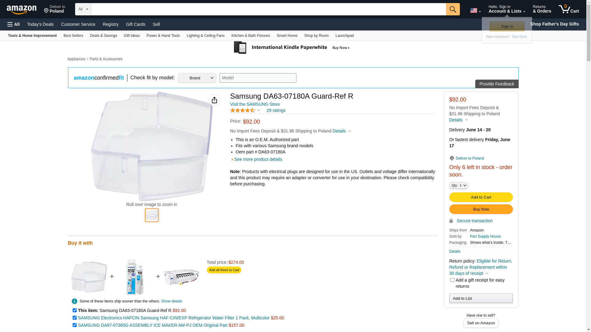 ![]() midwestapplianceparts.com | DA63-07180A-SAM-P | 1 | -2 | 1 | 1 @ $78.82 |
