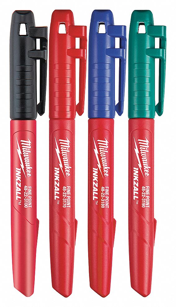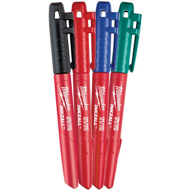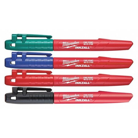 Milwaukee 48-22-3106 Pack of 6 (24 total). Marker Set, 1 mm Tip, Black/Blue/Green/Red, 5-1/2 in L.INKZALL, Jobsite markers feature clog-resistant tips and the ability to write through dusty, wet or oily surfaces. The durable marker tips are designed for writing on rough surfaces such as OSB, cinder block and concrete and the ink dries quickly to reduce smearing markings, without drying out quickly when the cap is left off. For added user convenience, the INKZALL markers have a built-in hard hat clip for easy storage and access. INKZALL, markers confirm to Milwaukee's commitment to best-in-class durability and their relentless mission to provide innovative solutions to the end user.