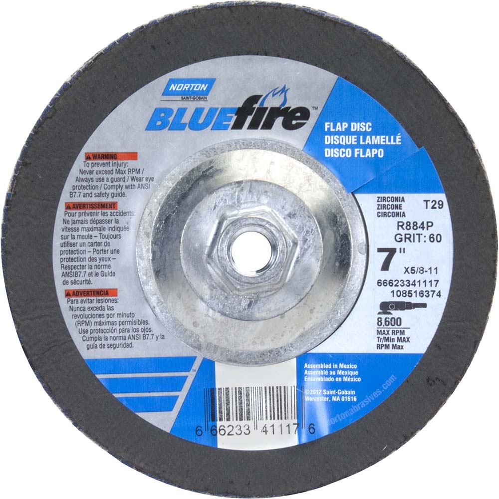 Norton BlueFire R884P Type 29 Conical Flap Abrasive Disc, 5/8"-11 Arbor, Zirconia Alumina Plus, 7" Diameter, 60 Grit (Pack of 2)
