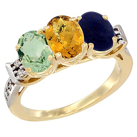 14K Yellow Gold Natural Green Amethyst, Whisky Quartz & Lapis Ring 3-Stone 7x5 mm Oval Diamond Accent, sizes 5 - 10