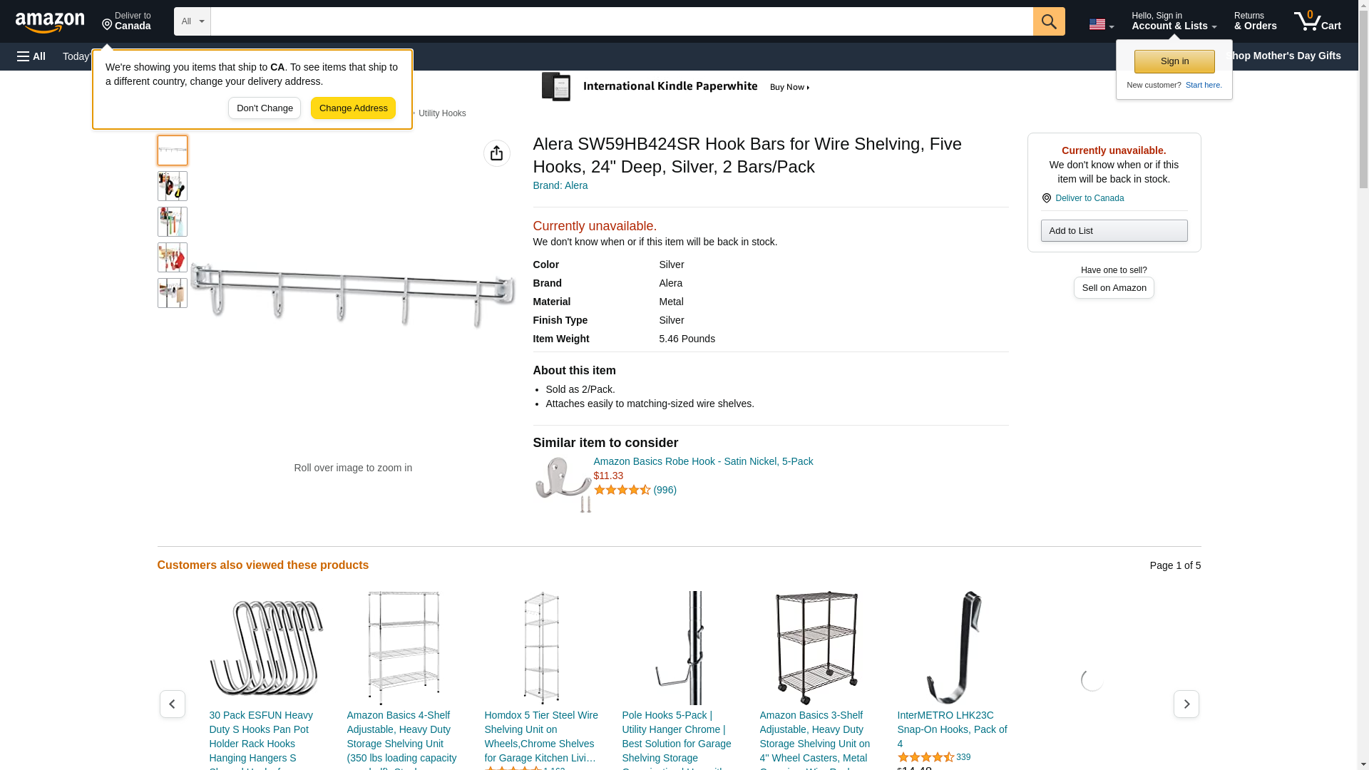 | Feature | "Hook Bars For Wire Shelving, Five Hooks, 24'' Deep, Silver, 2 Bars/Pack, Sold as 1 Package" |