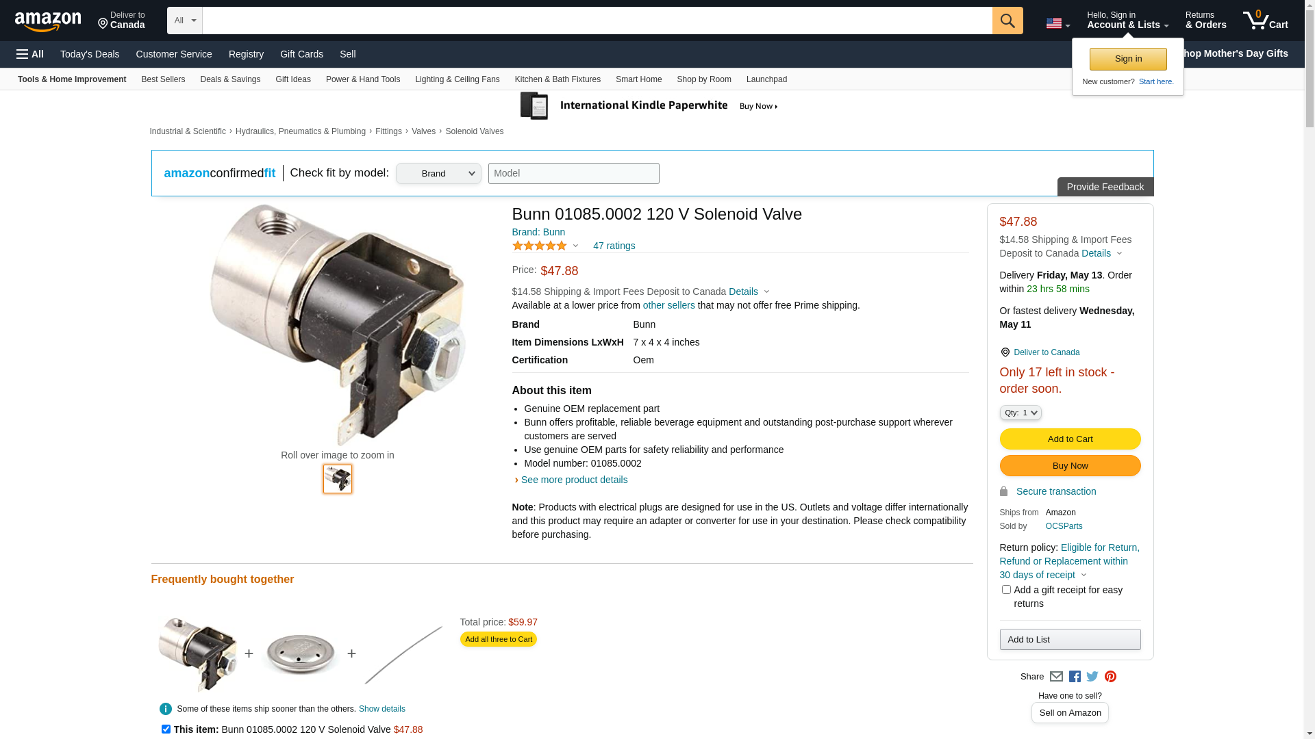 Bunn 01085.0002 Solenoid 120 Volt Kip Valve