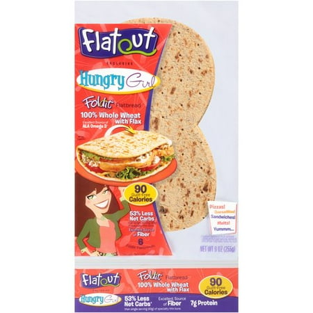 <b>Flatout Hungry Girl 100% Whole Wheat Foldit Flatbreads with Flax, 6ct:</b> <ul> <li>90 guilt-free calories</li> <li>Tasty</li> <li>43% less net carbs than sliced bread</li> <li>Excellent source of fiber</li> <li>Excellent source of ALA omega 3</li> </ul> <p></p>