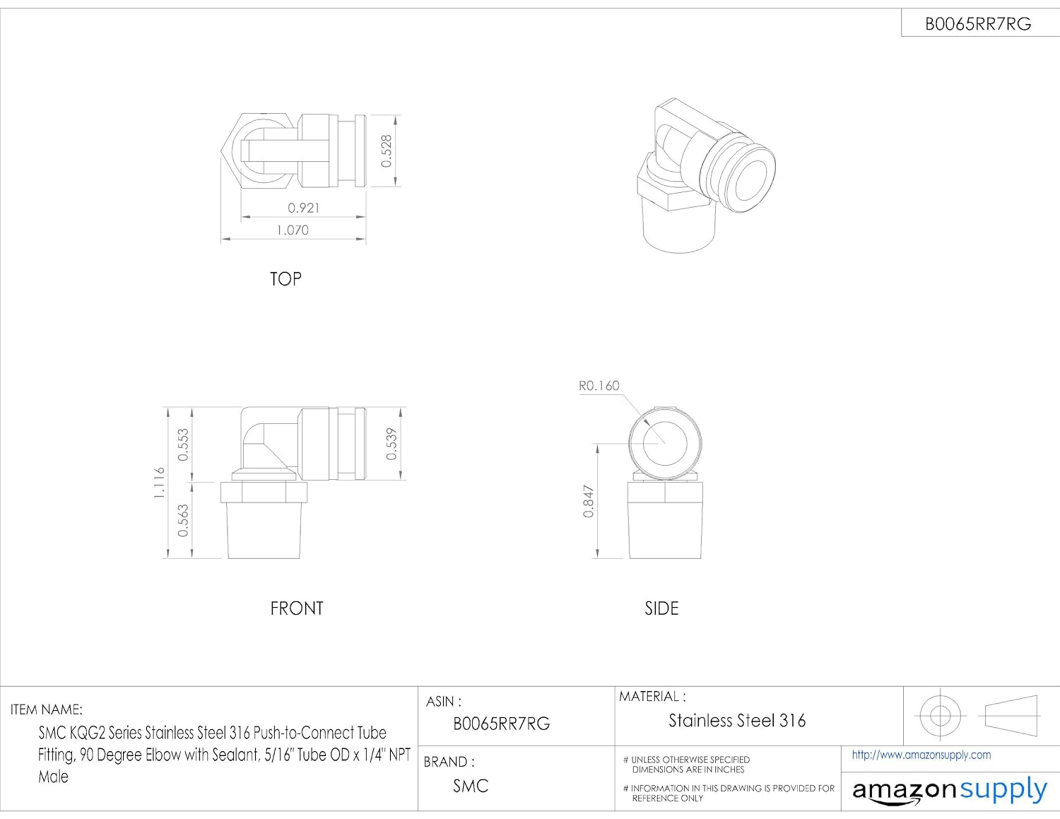 SMC KQG2 Series Stainless Steel 316 Push-to-Connect Tube Fitting, 90 Degree Elbow with Sealant, 5/16" Tube OD x 1/4" NPT Male
