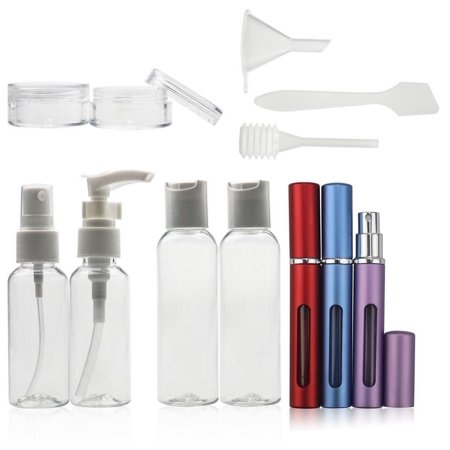<ul> <li>Perfumer bottle Easy to refill: can pump perfume from the bottom.</li> <li>Variety of high quality cosmetic containers each with a unique functionyou can conveniently transfer liquids and creams.</li> <li>BPA-free, made from environmentally friendly PET plastic, 100% recyclable, best travel accessories gift.</li> <li>Portable: suitable for traveling, mini body, easy to carry.</li> <li>Included:3* atomizer, 1* Long mouth pressure bottle ,1* spray bottle ,2* press cup bottle ,2* mask bottle1* small funnel and 1*small spoonEnjoy a stress-free flight.</li> </ul>