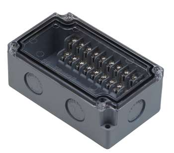 SG-TB-10PT-GC supports 10 circuits. ABS plastic with a voltage rating of 120V and a rated current of 15A. Molded knockouts accommodate 1/2 NPT thread.