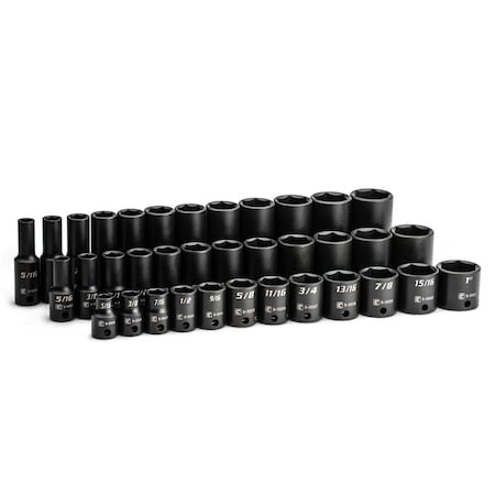- 36-piece set includes (12) 3/8 in. drive shallow impact sockets, (12) 3/8 in. drive semi-deep impact sockets, and (12) 3/8 in. drive deep impact sockets in the following sizes : 5/16, 3/8, 7/16, 1/2, 9/16, 5/8, 11/16, 3/4, 13/16, 7/8, 15/16, 1 in.