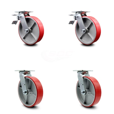 Polyurethane on Cast Iron Swivel Caster w/Main. Free Bearings Set of 4 w/8" x 2" Red Wheels - Includes 2 Swivel with Total Lock Brakes & 2 Swivel - 5000 lbs Total Capacity - Service Caster Brand
