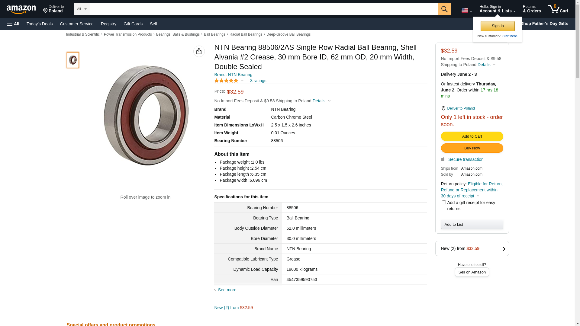 NTN Bearing 88506/2AS Single Row Radial Ball Bearing, Shell Alvania #2 Grease, 30 mm Bore ID, 62 mm OD, 20 mm Width, Double Sealed