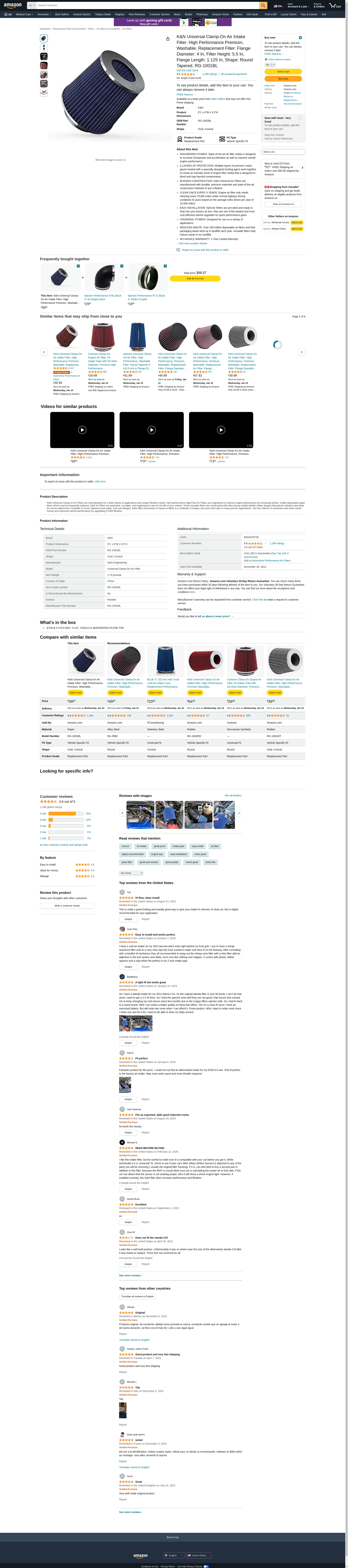 K&N Universal Clamp-On Air Intake Filter: High Performance Premium, Washable, Replacement Filter: Flange Diameter: 4 In, Filter Height: 5.5 In, Flange Length: 1.125 In, Shape: Round Tapered, RG-1001BL