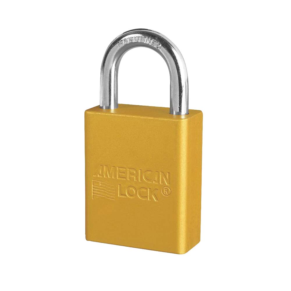 American lock aluminum padlock has a 1-1/2" (3.8cm) wide yellow anodized aluminum body, 1/4" (6mm) chrome plated, boron alloy shackle with 1" (2.5cm) clearance. Baked on powder-coated finish stays bright and is corrosive resistant finish for tough environments.