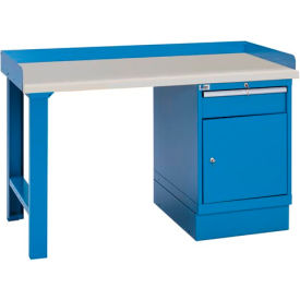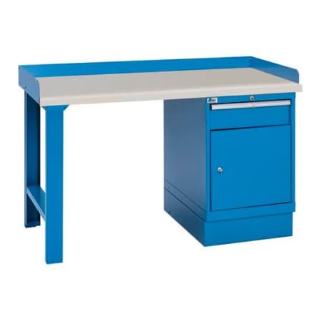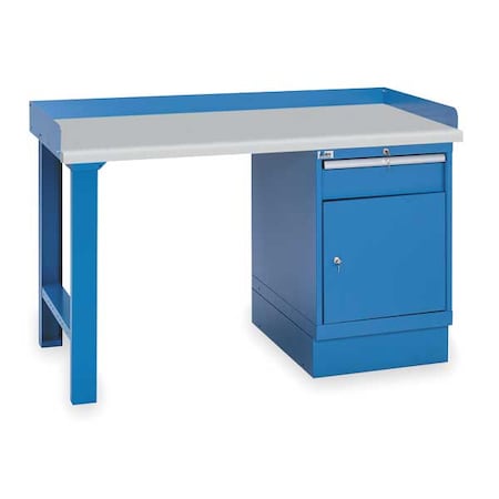 Preconfigured Industrial Workbenches Drawer capacity: 165 lb., based on evenly distributed loads 100% drawer extension Back and end stops extend 3 above work surface to retain small items Bright blue powder-coated finish Designed to maximize storage in the work area, while heavy-duty, steel construction provides durability in tough environments. Pedestals have ergonomically designed drawer handles located at the top of the drawer and are flush with pedestal front when drawer is closed for added safety. Drawers include preinstalled partitions with dividers. Pedestals have overall dimensions of 22-3/16W x 28-1/2D x 33-1/2H and come with a removable core lock for greater security and easy replacement. 2 keys included. Combination drawer/door pedestal features 1 drawer and hinged bottom door section with 1 fixed shelf. Drawer and door lock separately. 4 keys (keyed alike) included. Legs feature sturdy, 1-pc., all-welded construction with bottom hole for leveling glides (included). Feet have anchor holes for floor mounting. Models are also available with 13-1/2H x 10-1/2D steel riser shelf with 2H back stop. This listing is for each. This item requires special shipping, additional charges may apply. Product Details Type Single Pedestal Top Material Plastic Laminate Number of Drawers 1 Edge Type Square Style Back and End Stops Color Family Blue Weights & Dimensions Depth 30 in Width 60 in Drawer Weight Capacity 150 lbs Height 35-1/4 in