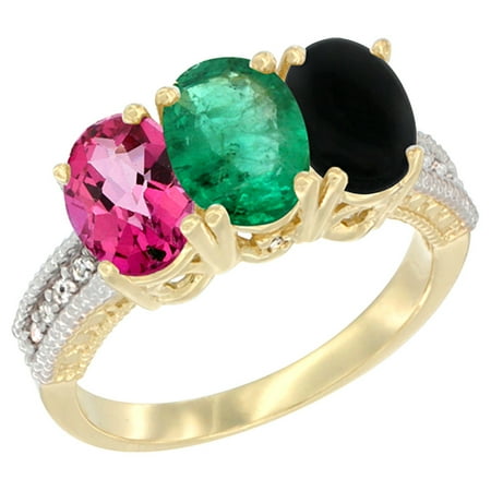 10K Yellow Gold Diamond Natural Pink Topaz, Emerald & Black Onyx Ring 3-Stone 7x5 mm Oval, sizes 5 - 10