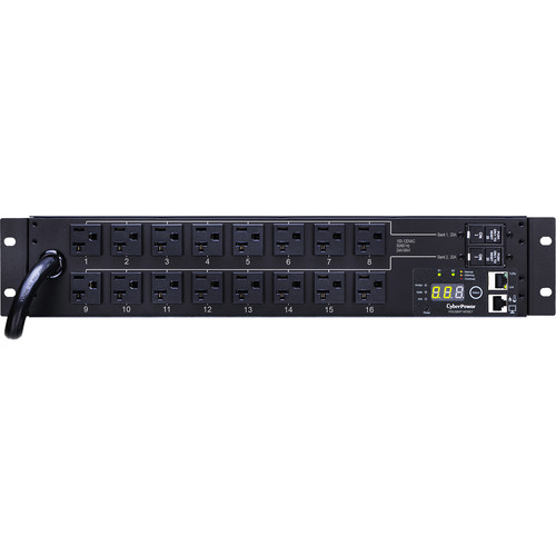 the Cyberpower (pdu30mt16fnet) 16-outlet 2u Rack Mount Monitored Power Distribution Unit (pdu) Provides 120v 30a Output. It Distributes Power To 16 Nema 5-20r Receptacles From A Single Twist Lock Nema L5-30p Plug, With Unfiltered Electrical Pass-through. Power Status Can Be Monitored Over The Network, Using Cyberpower Management Console And The Rj45 Ethernet Port For Local Network Connection, Or Locally Using The Lcd. The Front Lcd Displays The Electrical Current Used By Connected Equipment In Amps And Can Be Toggled To Display Input Voltage, Power Being Consumed In Watts, And The Ip Address Of The Network Interface.the Unit Has A Rugged, Industrial-grade Metal Housing And A 12-foot Ac Power Cord. It Can Be Mounted Horizontally, Includes A Cord Retention Tray And Is Ul60950_1 Fcc Class A Certified. A Three-year Warranty Is Standard.
