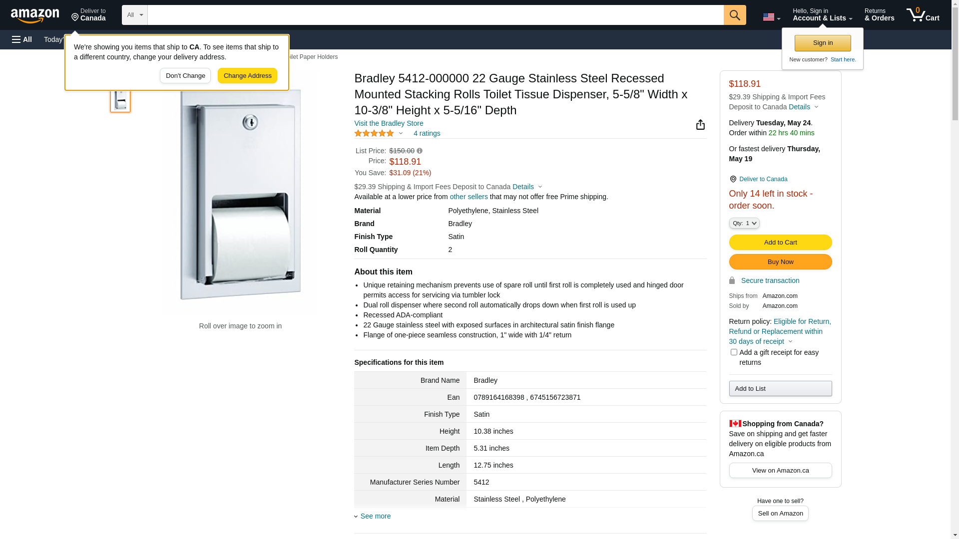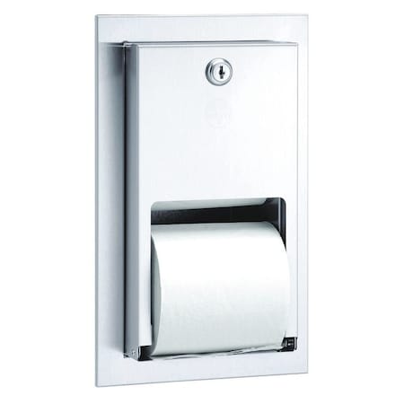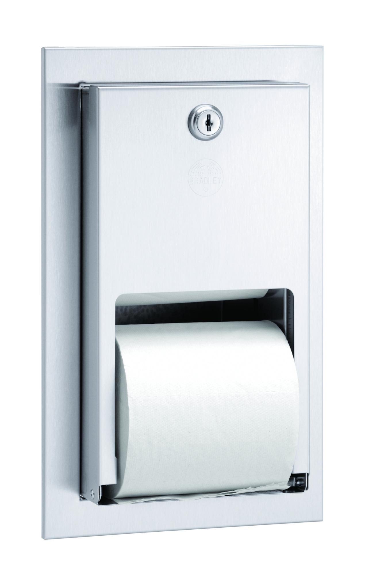 Bradley Toilet Tissue Dispenser, 5412-00 - The Bradley 5412-00 Toilet Tissue Dispenser is an attractive way to dispense toilet tissue in your commercial restrooms while protecting the environment. The dispenser is fashioned from an average of 25 percent post-consumer recycled content and 35 percent pre-consumer recycled content. This model is free of controlled delivery constraints, allowing users to freely turn the molded polyethylene spindles and dispense as much or as little toilet tissue as they wish. Made from stainless steel with an architectural satin finish, the dispenser cabinet can accommodate two rolls of standard core toilet tissue that are up to 5 inches in diameter. One roll is kept within reach, while the other is hidden inside of the cabinet. When the first roll is depleted, the second roll falls into place. Designed for recessed mounting and outfitted with a keyed tumbler lock, the unit requires a rough opening that measures 5-7/8 inches in width by 10-5/8 inches in height by 4 inches in depth. When installed properly, the toilet tissue dispenser is fully compliant with ADA barrier-free accessibility guidelines. s Satin Finish, Cabinet Type Housing, 1 Tumbler Lock, Non Controlled Delivery, Recycled Stainless Steel Content (Average) 25% Post-Consumer And 35% Pre-Consumer
