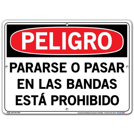 VESTIL DANGER SIGN SI-D-34-C-AC-130-S ALUMINUM COMPOSITE .130" overall size 14.5"W x 10.5"H Crossing Or Standing On Conveyor Is Forbidden PARARSE O PASAR EN LAS BANDAS ESTÁ PROHIBIDO