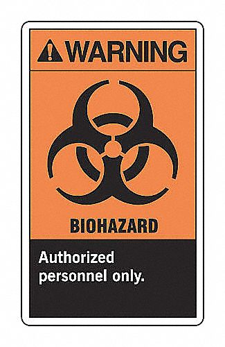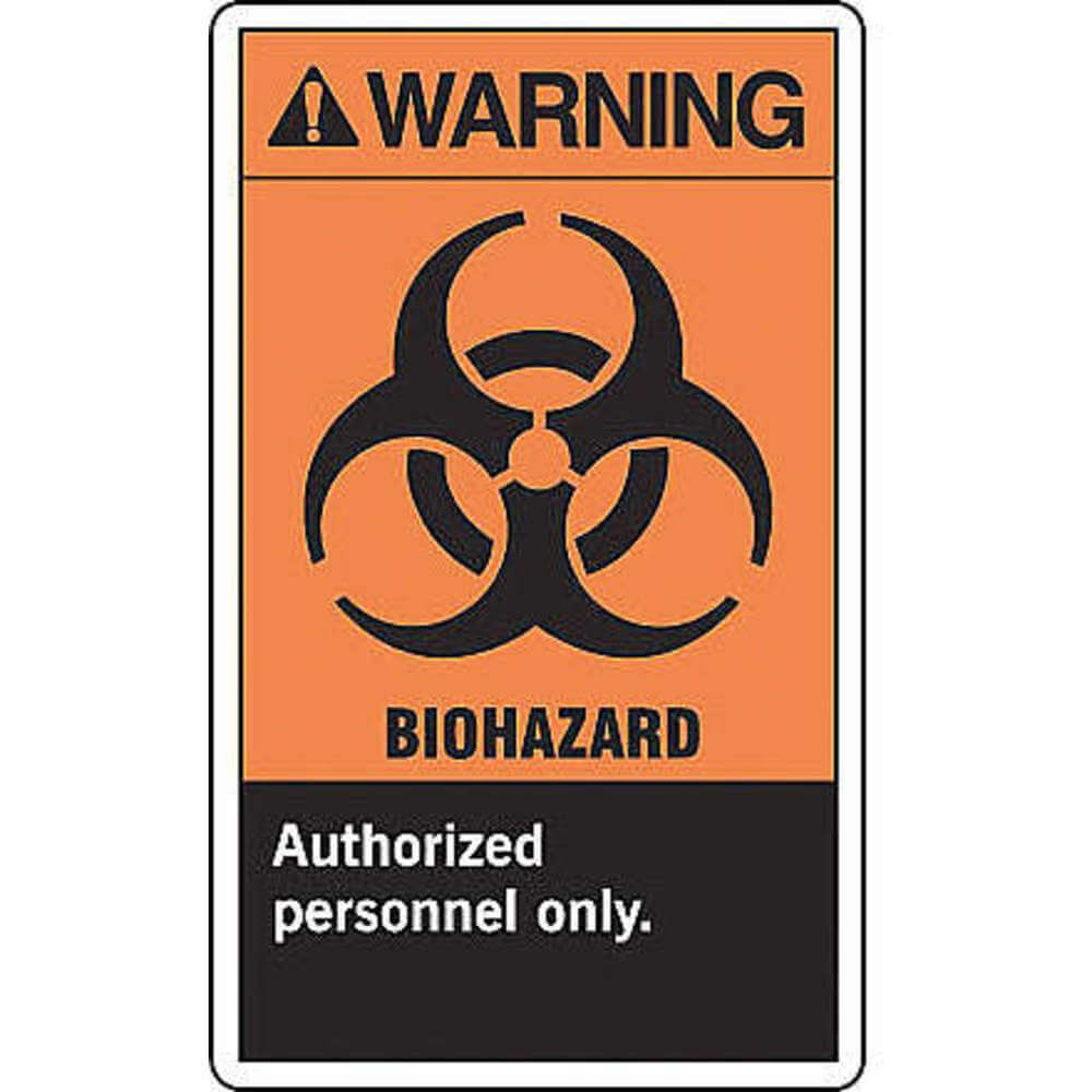 - <b>Price For:</b> Each <b>Legend Style</b>: Text and Symbol <b>Legend</b>: Biohazard Authorized Personnel Only <b>Subject Matter</b>: Personal Protection <b>Height</b>: 5" <b>Legend Color</b>: Black, White <b>Background Color</b>: Black, Orange <b>Header</b>: WARNING <b>Language</b>: English <b>Shape</b>: Rectangle <b>Legend/Background Color</b>: Black/White <b>Self-Adhesive</b>: Yes <b>Header Background Color</b>: Orange <b>Width</b>: 3-1/2"