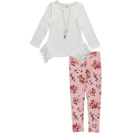 This Just Kids outfit is a stylish head-to-toe look she'll cherish! Just Kids 2-piece outfit with necklace Long-sleeved rib-knit top with crocheted mesh panels and pom pom trim at sides (53% rayon, 43% polyester, 4% spandex) Embossed stretch knit leggings with elastic waistband (96% polyester, 4% spandex) Necklace included Hand wash cold Made in USA