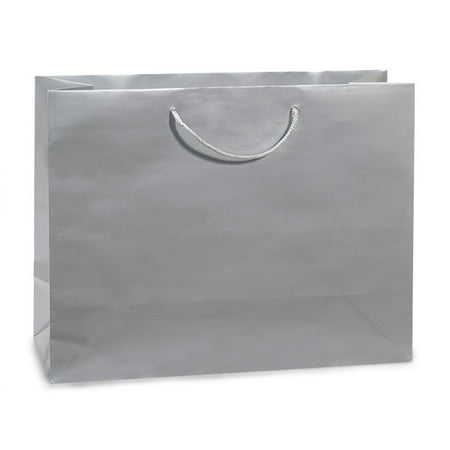 <ul> <li>Silver Gloss Medium Gift Bags 100 13x5x10"</li> <li>Deluxe Gloss Color Laminated Paper Totes are made of heavyweight 150 gsm laminated paper, with cardboard bottom inserts, and coordinating cord handles.</li> </ul>