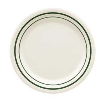 A traditional look enhanced by two bands of emerald green frame all pieces of this pattern in the Centennial series. This straight forward, clean pattern is sure to be a crowd pleaser. Your scratch resistant material of choice. Dinner Plate, 9", melamine, green bands on ivory base, Centennial Emerald Sold by the dozen.