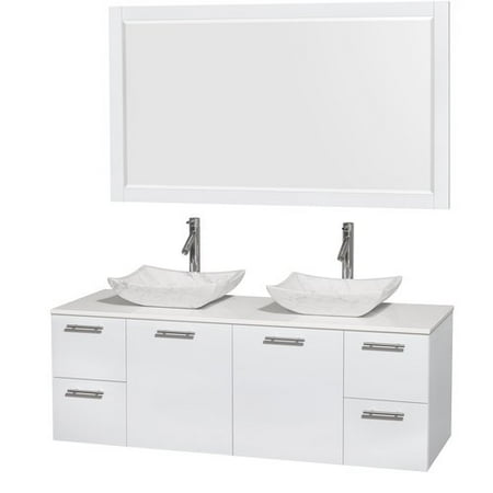 <br /> <b>Wyndham Collection Amare 60" Double Bathroom Vanity, Glossy White, White Man Made Stone Countertop, Avalon White Carrera Marble Sinks, and 58" Mirror:</b> <ul> <li>Constructed of the highest grade MDF, engineered for durability to prevent warping and last a lifetime</li> <li>8-stage preparation, painting and finishing process</li> <li>Highly water-resistant low VOC sealed finish</li> <li>Unique and striking contemporary design</li> <li>Modern Wall-Mount Design</li> <li>Minimal assembly required</li> <li>Deep Doweled Drawers</li> <li>Fully-extending soft-close drawer slides</li> <li>Single-hole faucet mount</li> <li>Available with Porcelain, Granite, and Marble vessel sink(s)</li> <li>Faucet(s) not included</li> <li>58" Mirror included</li> <li>Metal exterior hardware with brushed chrome finish</li> <li>2 functional doors</li> <li>4 functional drawers</li> <li>Plenty of storage space</li> <li>Includes drain assemblies and P-traps for easy assembly</li> <li>Quality Guaranteed, Comes with a Manufacturer 2-year Limited Warranty</li> </ul>
