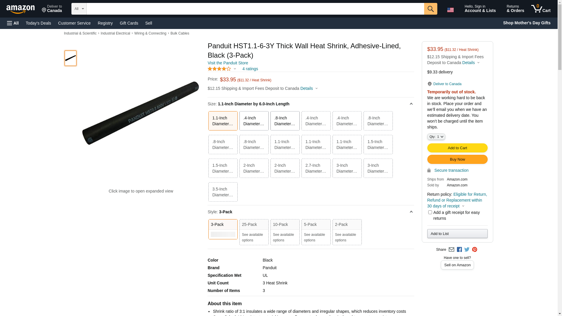 Panduit HST1.1-6-3Y Thick Wall Heat Shrink, Adhesive-Lined, Black (3-Pack)