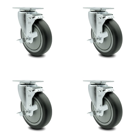 Thermoplastic Rubber Swivel Top Plate Caster Set of 4 with 5 Inch Gray Wheels - Includes 4 Swivel with Top Lock Brakes - 1200 lbs. Total Capacity - Service Caster Brand