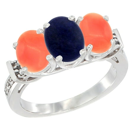 14K White Gold Natural Lapis & Coral Sides Ring 3-Stone Oval Diamond Accent, sizes 5 - 10