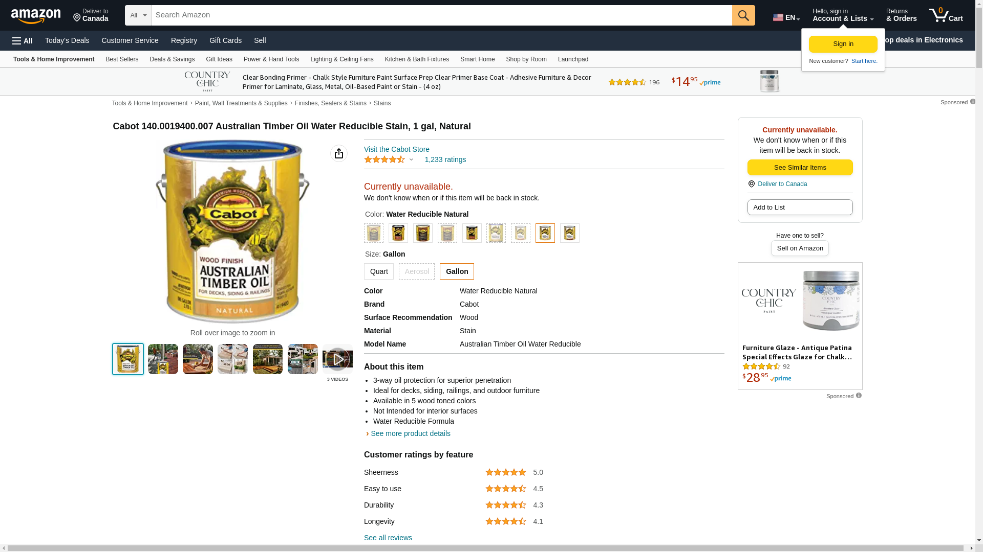 Features. Australian Timber Oil Gallon Wood Finish. 250 VOC Compliant In All States. All The Benefits Of Traditional Oil Deep Penetration Color Clarity. Plus The Benefits Of Water. Low Odor Soap Water Clean Up. Use On Decks Siding Outdoor Furniture.. Pack of 4. Dimension - 7.5 x 7.5 x 7.5 in.. Item weight - 9.5 lbs.
