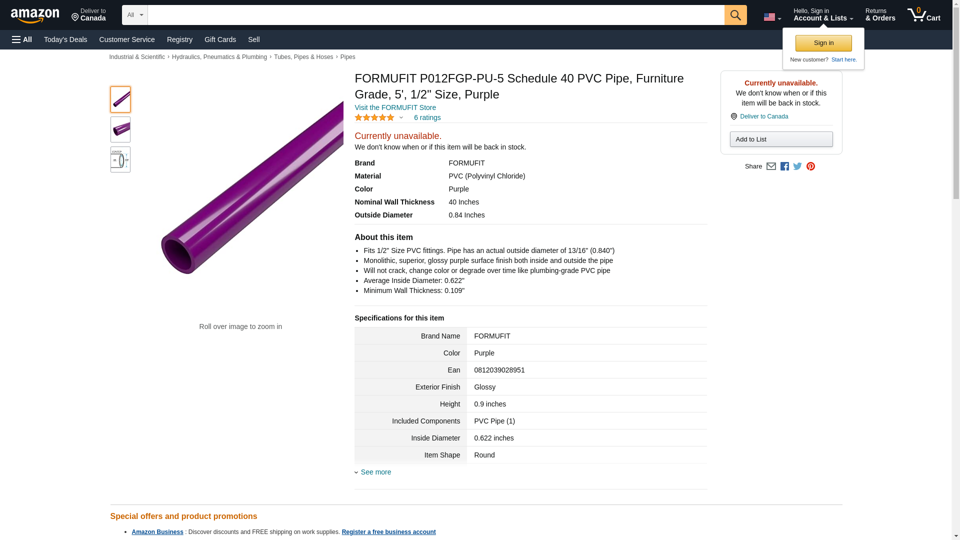 FORMUFIT P012FGP-PU-5 Schedule 40 PVC Pipe, Furniture Grade, 5', 1/2" Size, Purple