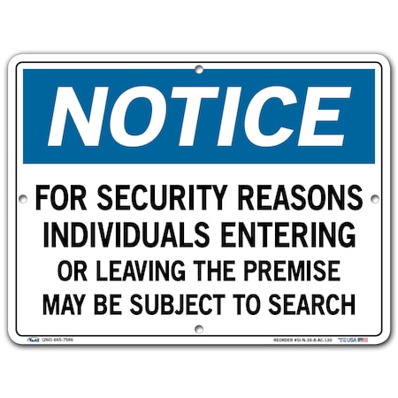 Vestil SI-N-39-B-AC-130 Notice Sign, "For Security Reasons Individuals Entering or Leaving The Premise May Be Subject to Search", 9.5" Height, 12.5" Wide, 0.13" Length Composite
