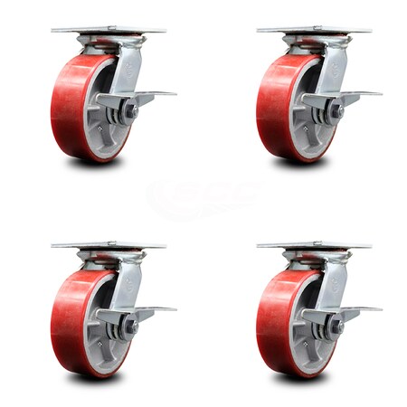 Heavy Duty Large Top Plate Polyurethane on Cast Iron Swivel Caster Set of 4 w/6" x 2" Red Wheels - Includes 4 Swivel w/Side Lck Brakes - 4800 lbs Total Capacity - Service Caster Brand