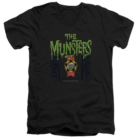 Trevco Munsters-50 Year Logo Short Sleeve Adult 30-1 V-Neck Tee, Black - Small