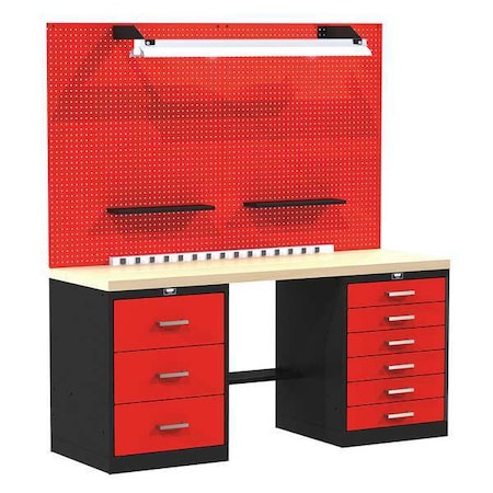 FKBASIC-SM-M Size: 78" H x 60" W x 24" D Features: -Includes 2 pedestals with drawers or doors, work top, pedestal shelf, pegboard, light kit, electrical strip and pegboard shelves. -Fort Knox collection. -Color: Black and red. -Pattern: Textured. -All-welded cabinets and pedestals. -All heavy gauge steel (varies by system component). Finish: -Black and red. Drawers Included: -Yes. Shelves Included: -Yes. Top Material: -Wood. Frame Material: -Metal. Country of Manufacture: -United States. Dimensions: -Pedestal width: 18" and 24". Size 78" H x 72" W x 24" D - Overall Height - Top to Bottom: -78". Size 78" H x 72" W x 24" D - Overall Width - Side to Side: -72". Size 78" H x 72" W x 24" D - Overall Depth - Front to Back: -24". Size 78" H x 60" W x 24" D - Overall Height - Top to Bottom: -78". Size 78" H x 60" W x 24" D - Overall Width - Side to Side: -60". Size 78" H x 60" W x 24" D - Overall Depth - Front to Back: -24".