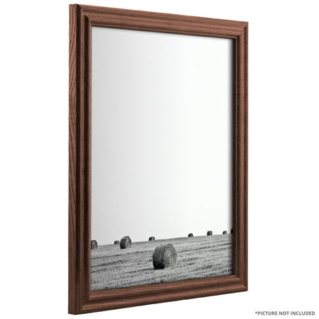 <ul> <li>Traditional style; semi-gloss walnut brown stain finish; visible wood grain **COLOR AND GRAIN PATTERN MAY VARY SLIGHTLY WITH EACH FRAME**</li> <li>Frame includes: clear acrylic facing, rigid cardboard backing and wire hanging hardware kit (some assembly required)</li> <li>Frame holds a 8 inch by 33 inch photo/print/poster (viewable area reduced by .25" on each side due to frame lip)</li> <li>Frame moulding is 0.75 inches wide; solid Ash wood construction</li> <li>Frame is designed for WALL HANGING only (hanging hardware allows for portrait or landscape orientation)</li> </ul>