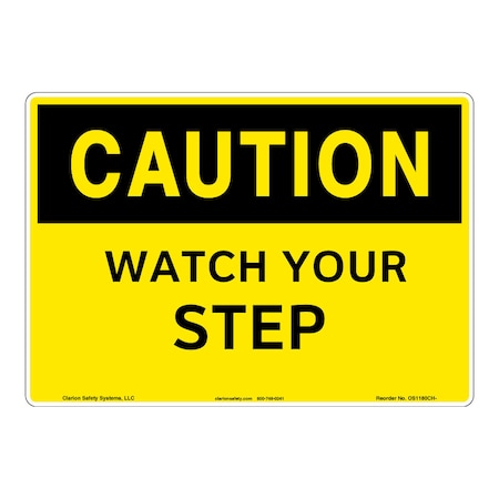 <p><strong>Word Message: </strong><br />WATCH YOUR STEP</p> <p><strong>Description: </strong><br />Clarion Safety Systems brings you Caution Watch Your Step safety signs (OS1180CH-) which are produced on premium plastic or aluminum material and are designed to meet your OSHA safety sign needs.<p><strong>Material Information:</strong></p> <ul> <li><strong>Material</strong>: (BE) Indoor/Outdoor Aluminum</li> <li><strong>Base Materials</strong>: .040" Rigid White Aluminum</li> <li><strong>Overlaminate</strong>: none</li> <li><strong>Mounting Option</strong>: Mounting holes</li> <li><strong>Application</strong>: Indoor/Outdoor</li> <li><strong>MaxTemp</strong> (F): 175</li> <li><strong>MinTemp</strong> (F): -40</li> <li><strong>Chemical Resistance</strong>: Good</li> <li><strong>UV Resistance</strong>: Good</li> <li><strong>Outdoor durability</strong>: Good</li> <li><strong>Storage Stability</strong>: Stable. Optimum storage conditions: 72 F @ 50% relative humidity</li> <li><strong>Expected Life Indoor</strong>: Long term</li> <li><strong>Expected Life Outdoor</strong>: 3-5 year (expected outdoor life may vary due to climatic conditions)</li> <li><strong>RoHS</strong>: Yes</li> <li><strong>CRoHS</strong>: Yes</li> <li><strong>REACH</strong>: No</li> </ul>