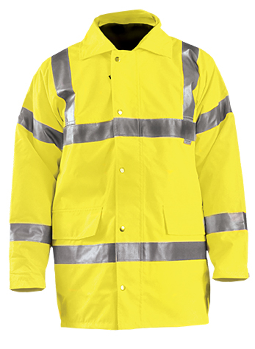 | Feature | <b>Price For:</b> Each <b>ANSI Class</b>: 3 <b>Insulated</b>: Yes <b>Material</b>: 100% Polyester <b>Closure Type</b>: Zipper and Snaps <b>Standards</b>: ANSI/ISEA 107-2010 <b>Size</b>: 2XL <b>Length</b>: 36" <b>Fabric Weight</b>: 300D <b>Item</b>: Jacket <b>Number of Outside Pockets</b>: 4 <b>Color</b>: yellow <b>Number of Inside Pockets</b>: 3 <b>Gender</b>: Men\'s <b>Fits Chest Size</b>: 60" <b>Lining Material</b>: Polyester/Cotton |