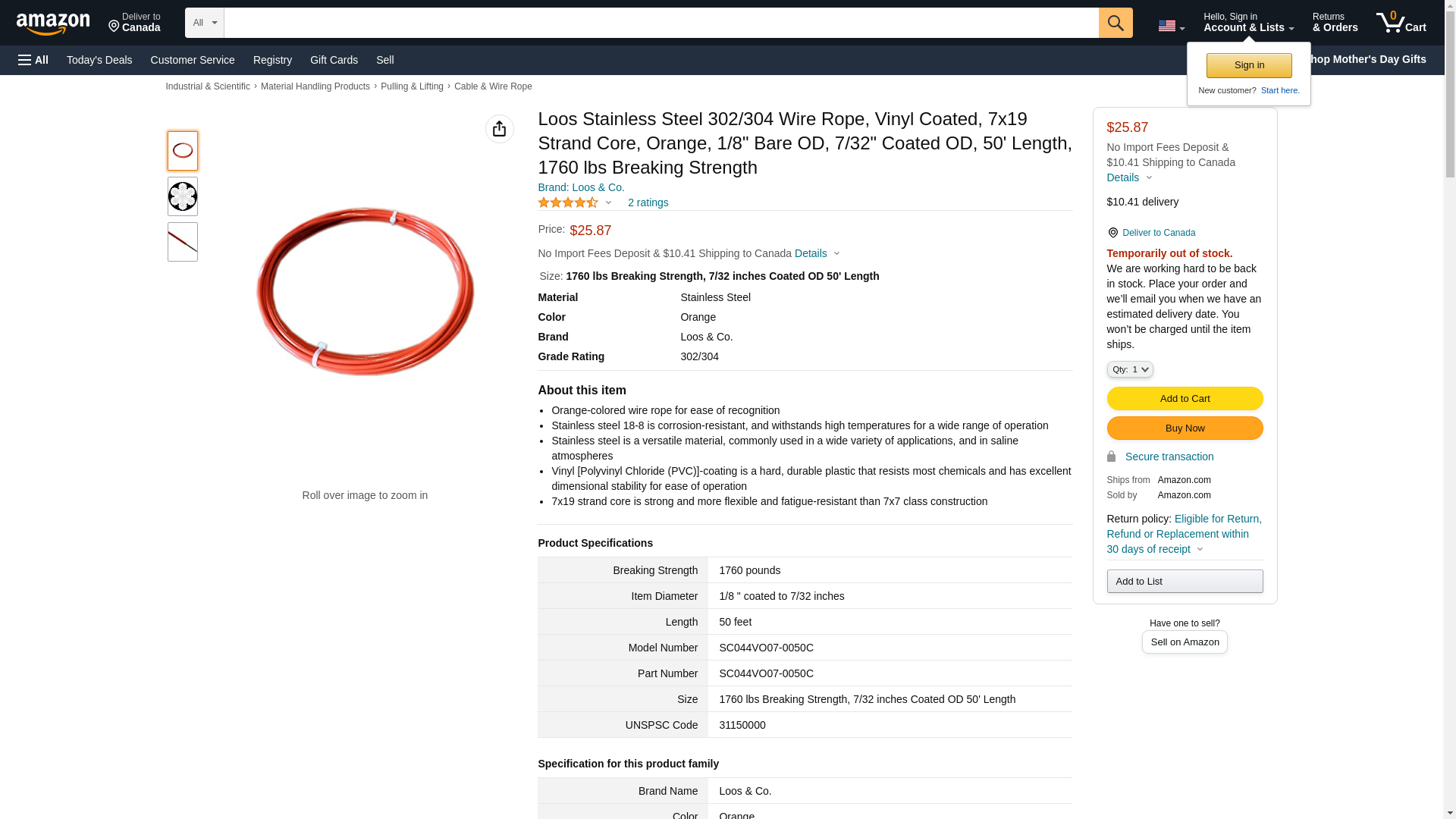 Loos Stainless Steel 302/304 Wire Rope, Vinyl Coated, 7x19 Strand Core, Orange, 3/16" Bare OD, 1/4" Coated OD, 10' Length, 3700 lbs Breaking Strength