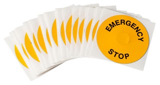 | Feature | <b>Price For:</b> Each <b>Material</b>: Polyester <b>Legend/Background Color</b>: Black/Yellow <b>Shape</b>: Round <b>Legend</b>: Emergency Stop <b>Item</b>: Legend Plate Label <b>Diameter</b>: 3.50" <b>For Use With</b>: 22mm Push Buttons <b>Country of Origin (subject to change)</b>: United States |